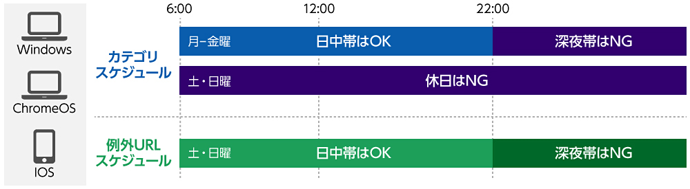 時間に応じた利用制限に対応します。例外処理していたURLに対しても時間に応じた利用制限をかけることが可能となります。