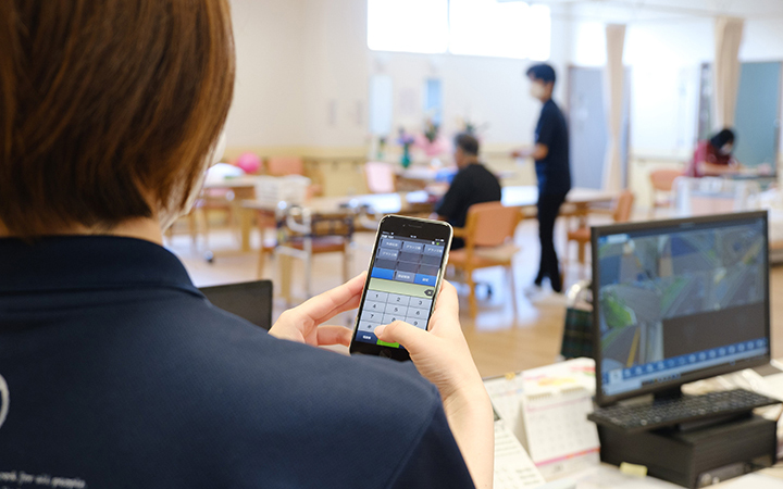 また『CAREKARTE』に入力した介護記録は、本施設外からも閲覧することが可能です。入所者の体調や病状が悪化した場合、隣接する病院の医師に診ていただくのですが、これまではパソコンの画面を見ながら手書きでメモを取り、それを持ち歩いていました。それがスマートフォンの画面を見せることができるようになったため、簡単かつ正確に介護記録を伝えられるようになりました。