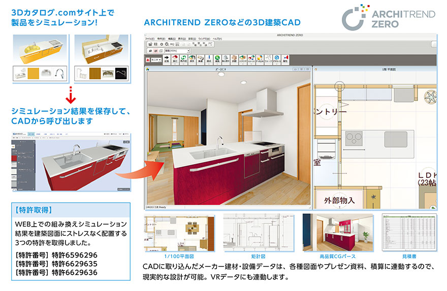 また、国内最⼤級のデジタル建材コンテンツ「3Dカタログ.com」をご利⽤いただく事でメーカー建材、設備データを基本設計から積算に⾄る