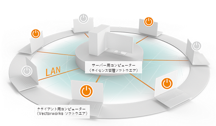 Vectorworks 2026ネットワーク版は、サーバー/クライアント形式でライセンスを管理し、Vectorworksソフトウエアを使用することができます。サーバー用コンピューター上のVectorworks Site Protection Server(以下、ライセンス管理ソフトウエア)が同時稼働するライセンス数を管理し、クライアント用コンピューターで、必要な時に、ライセンス管理ソフトウエアからライセンスを取得してVectorworksを起動することができます。