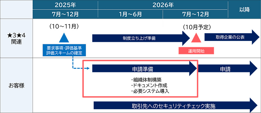 2026年の本格導入に向け、経済産業省を含む関係機関では「サプライチェーン強化に向けたセキュリティ対策評価制度」の具体的な設計について段階的にアップデートが進められる予定です。2025年4月に中間取りまとめが公表された後、業界や有識者とのさらなる議論を経て、2025年11月に★レベルに応じた要求事項が確定するといわれています。