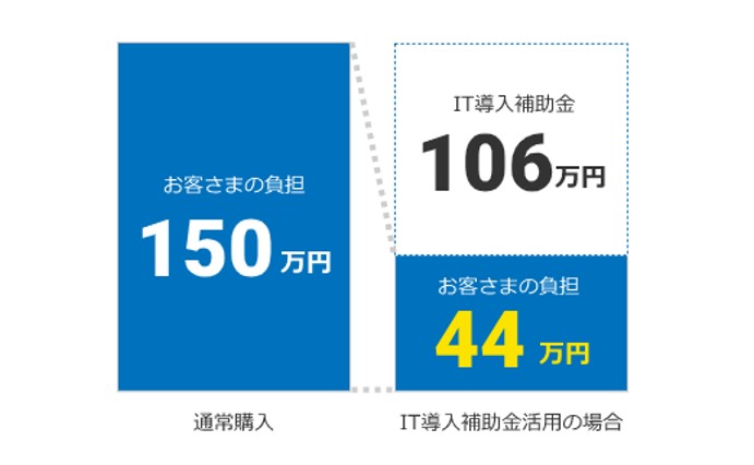 満額交付されることになった場合は、150万円-106万円=44万円の経費負担で導入が可能ということになります。