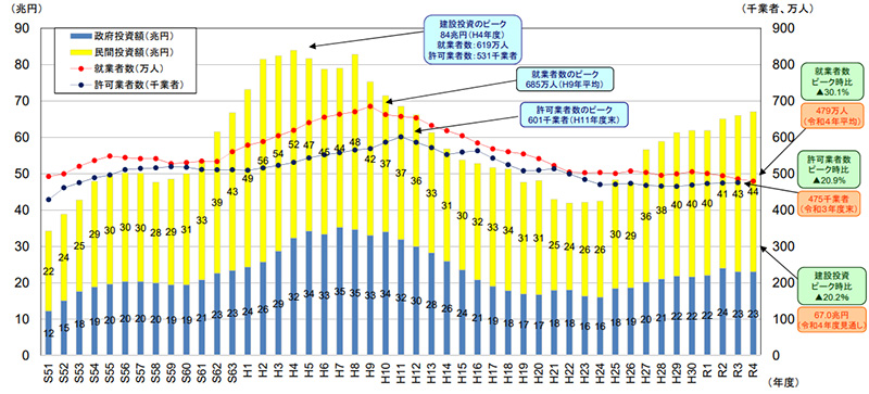 その後増加に転じ令和4年は67兆円(民間投資44兆円、政府投資23兆円)まで回復していますがピーク時比でマイナス20.2%と厳しい状況が続いています。