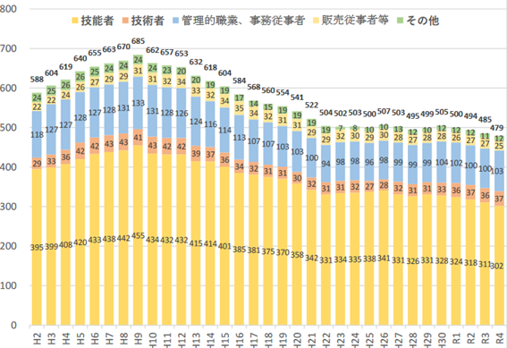 また、就業者数の推移は、平成9年の685万人をピークに就業者数の減少に歯止めがかからず、令和4年は、479万人とピーク時比でマイナス30.1%と人手不足が深刻であることが分かります。特に技能者(職人)は、平成9年445万人いましたが、令和4年では302万と就業者減少の大きな要因となっています。