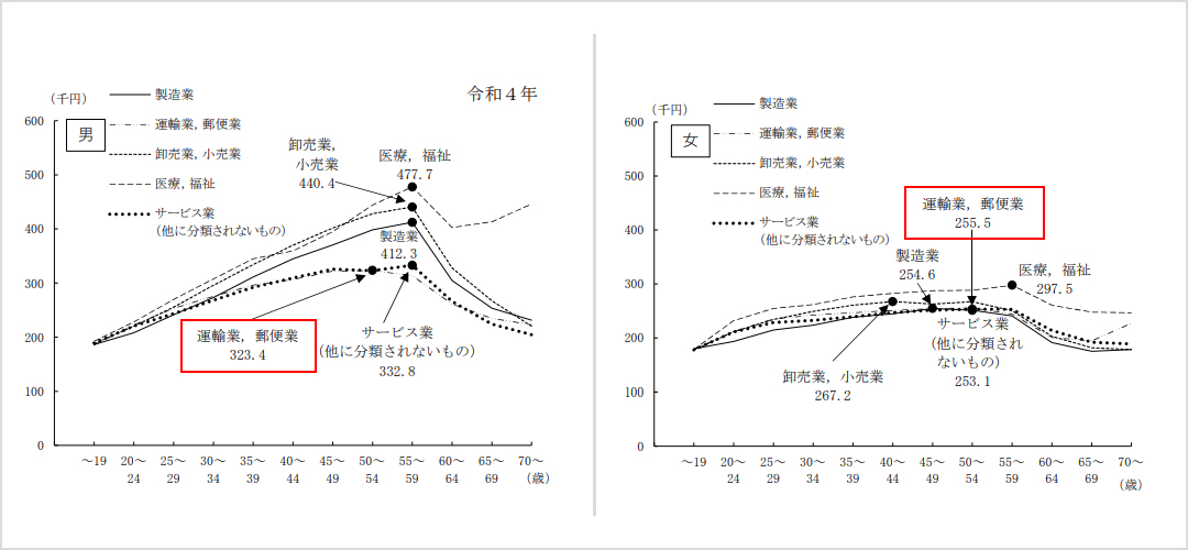 トラックドライバーは、全職業に比べて低い賃金と長時間労働の傾向にあり、これこそが人手不足の要因と考えられています。厚生労働省が調査した、令和4年度の主な産業、性、年齢階級別賃金を表で見ますと男性の運輸業は323.4千円と一番低い結果です。