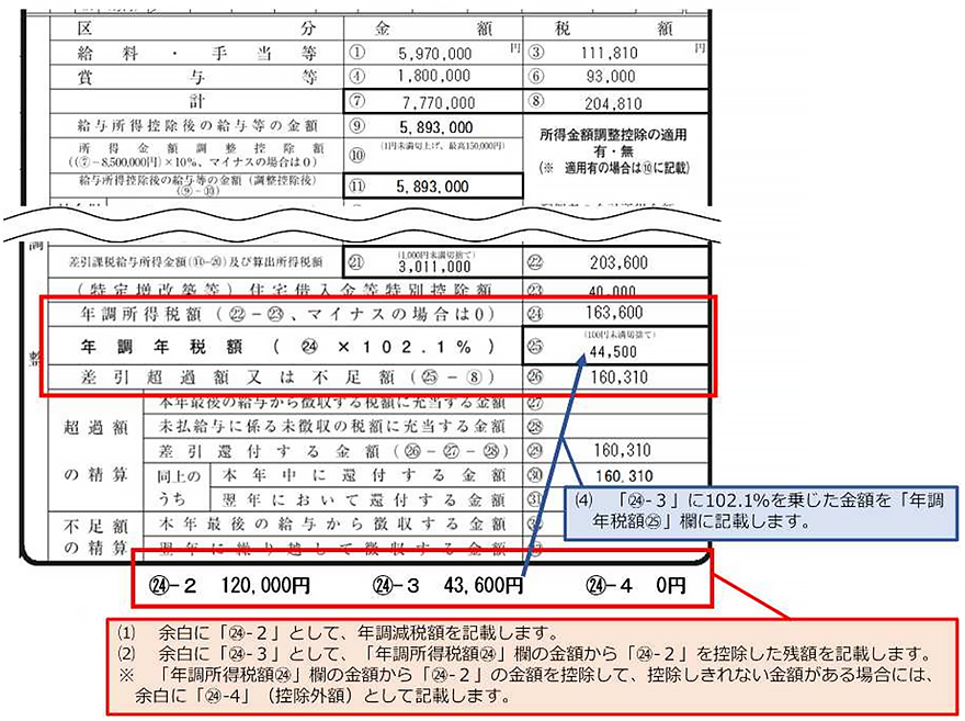 また「源泉徴収税額」欄には、年調所得税額から年調減税額を控除した残額に復興特別所得税(102.1%)を加算した金額を記載します。