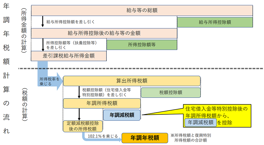 定額減税後、復興特別所得税(×102.1%)を加算して年調年税額を算出し、過不足額を精算します。
