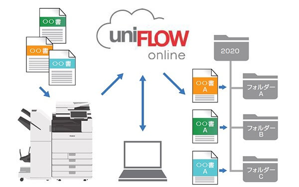 キヤノンの「uniFLOW Online Cloud Scan Advanceファイリングアシスト」は複合機の機能を拡張し、紙文書の電子ファイリングを自動化・効率化する「ファイリングアシスト」機能を搭載しています。