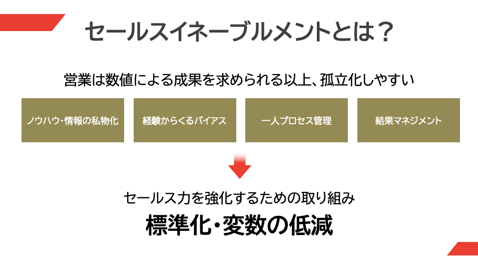 垣内「もちろんです。一元管理をしながら、課題を抽出して、PDCAを回せる人、もしくはチームですね。経営者がそこまで見るとベストではありますが。そして、最後にはセールスイネーブルメントという考え方になります」
