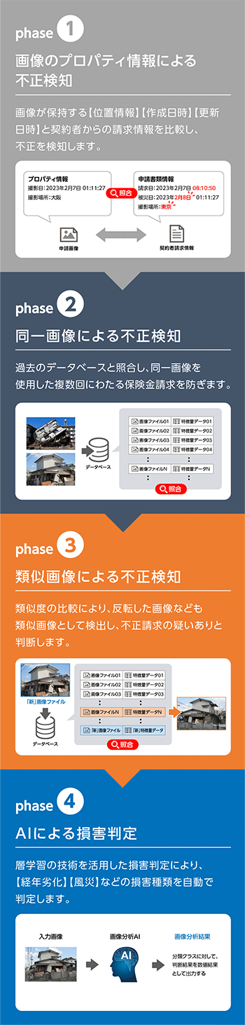 画像が保持する【位置情報】【作成日時】【更新日時】と契約者からの請求情報を比較し、不正を検知します。