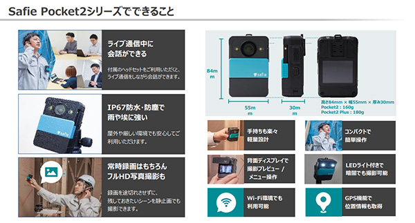 Safie Pocket2はバッテリーで駆動する小型のウェアラブルカメラです。ヘッドセットを使えば、映像だけでなく音声で遠隔地との通話が可能。IP67という高い防水・防塵性能を実現しているので建設現場にも最適といえます。