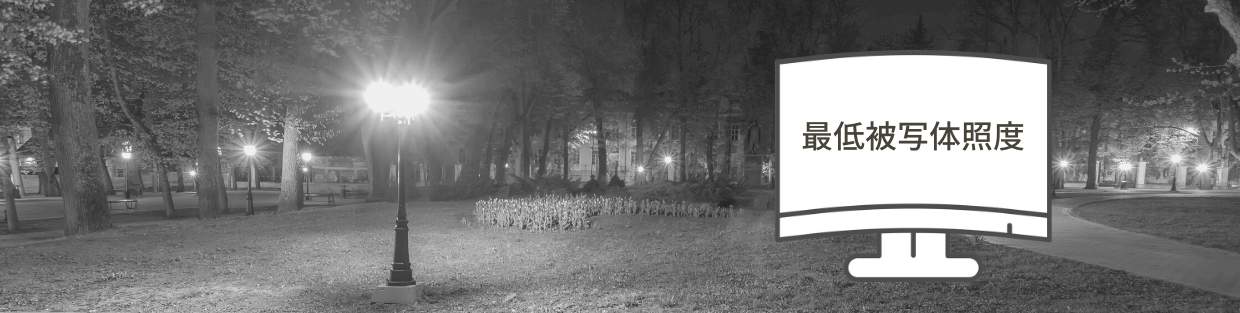 「最低被写体照度」とは、カメラが被写体を写すために最低限必要な照度(明るさの度合い)のこと。防犯カメラでは、最低被写体照度の性能は「カメラレンズのF値」「イメージセンサーの感度」「映像エンジン」の3つの要素が総合的に関わり決まります。そして、屋外で暗所や夜間を防犯カメラで撮影するためには、顔が確認できるレベルの照度である0.5lux以下の最低被写体照度が必要です。