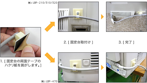 電源コード固定台の両面テープのハクリ紙を剥がし、所定の位置に貼るだけの簡単な作業で電源コネクタおよび差し込み口のストレスを緩和します。