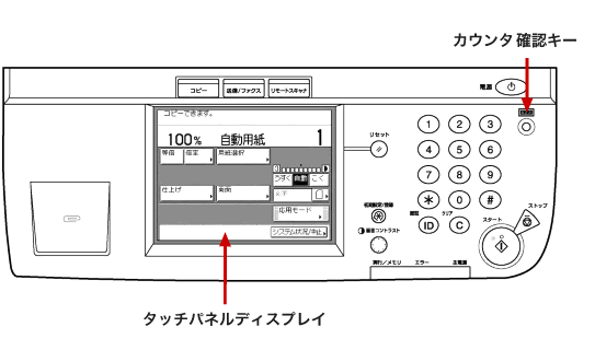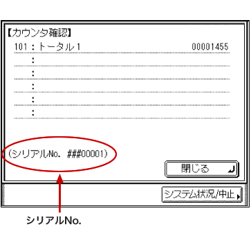 • (1)操作パネル上のカウンタ確認キーを押し、タッチパネルディスプレイにシリアルNo.を表示させます。