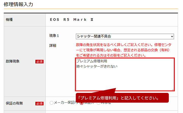 「プレミアム修理」をご利用いただく際は、故障現象 詳細欄に「プレミアム修理利用」と記入をお願いします。
